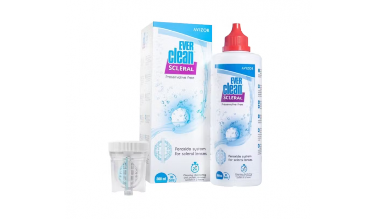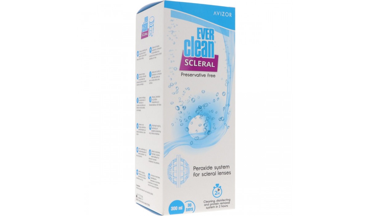 Ever Clean Scleral è una soluzione a base di perossido d'idrogeno detergente e ad alto potere disinfettante, adatta a tutti i tipi di lenti a contatto morbide, RGP e sclerali.